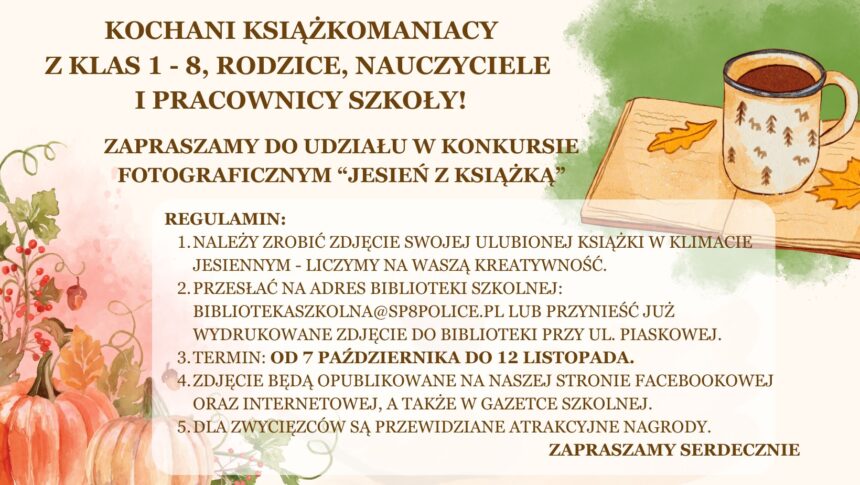 Konkurs fotograficzny ,,Jesień z książką” 7 października 2025 Share Tweet Pin it Uwaga Drodzy Książkomaniacy! Zapraszamy całą społeczność szkolną do konkursu fotograficznego "Jesień z książką". Więcej informacji na plakacie. Previous Post Edukacja matematyczna Next Post Lekcja biblioteczna