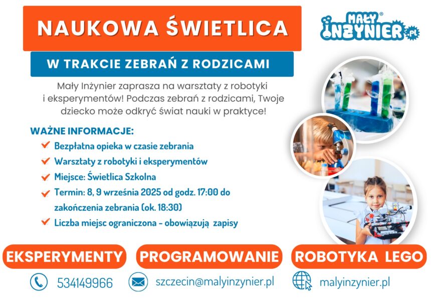 Naukowa Świetlica- ogłoszenie 7 września 2025 Share Tweet Pin it Drodzy Rodzice kl. 1 - 3! Mamy dla Was ciekawą propozycję. Zachęcamy do zapoznania się z informacjami umieszczonymi na plakacie. Previous Post ,,Słuchaj, teraz czytam"- konkurs z okazji Dnia Głośnego Czytania Next Post Zebrania z rodzicami- harmonogram