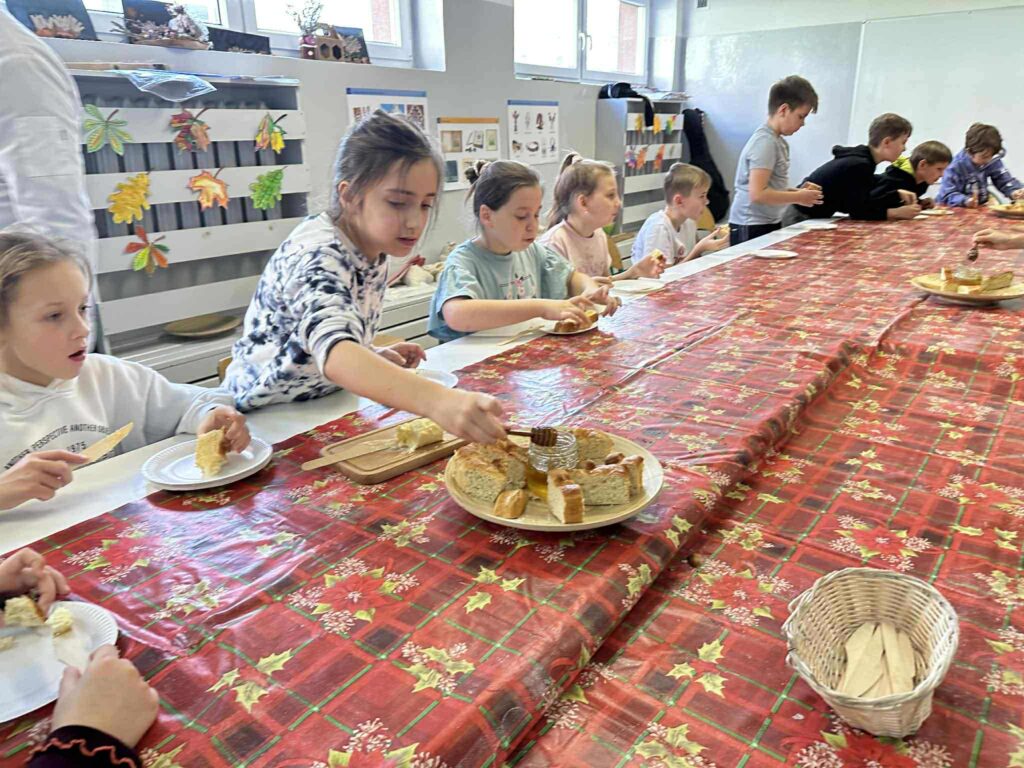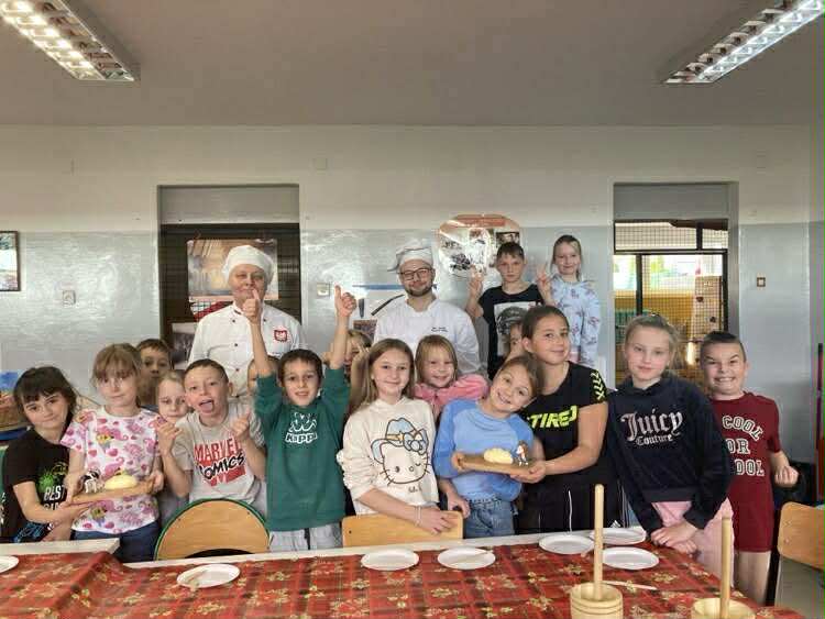 Nasi przemili prowadzący zadbali nie tylko o praktykę, ale i o wiedzę, opowiadając o ciekawostkach związanych z wypiekiem i pochodzeniem chleba. A żeby było jeszcze weselej, Pan Krzysztof zagrał na gitarze i umilił nam czas fajnymi przyśpiewkami! 🎸