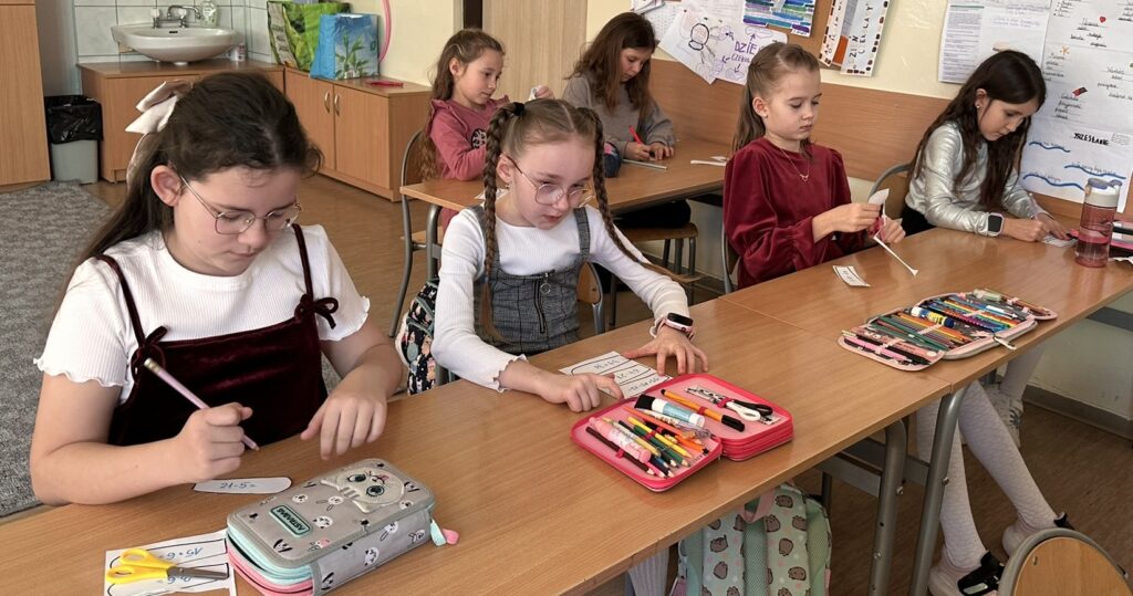 W takim dniu nie mogło zabraknąć matematycznych kwiatów. Na szarym papierze czekał wazon, łodygi i środki kwiatów. Na kartkach A3 — płatki z działaniami. Zadanie polegało na policzeniu, wpisaniu wyniku, wycięciu i sprawdzeniu go w „biurze rachunkowym” przy biurku nauczyciela. Gdy wynik był poprawny: – płatki z wynikami nieparzystymi kolorowaliśmy na różowe. Efekt końcowy? Kolorowa łąka matematycznej chwały.