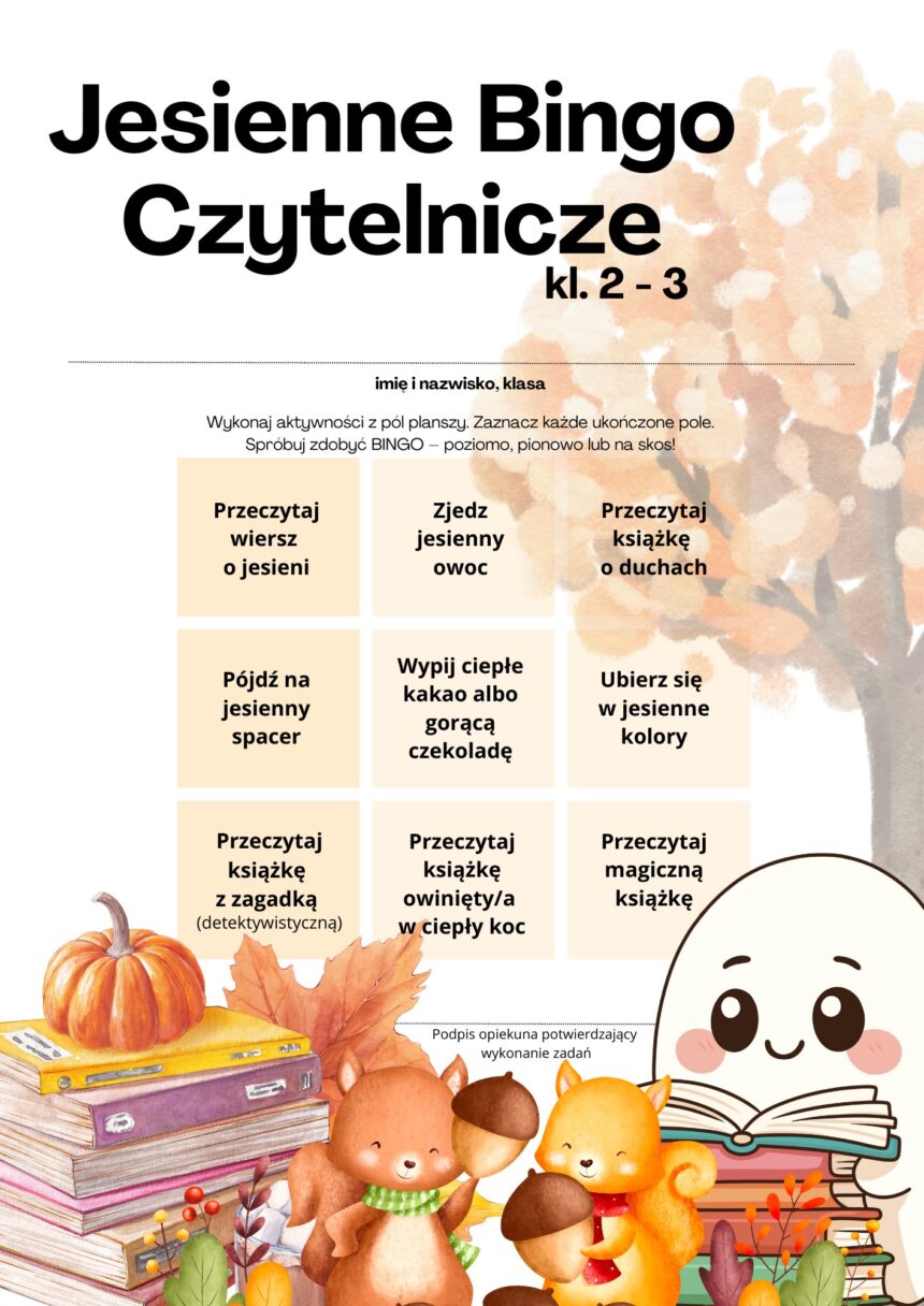 Przygotowaliśmy specjalną planszę „Jesienne Bingo Czytelnicze”, pełną ciekawych zadań — niektóre związane są z czytaniem, inne z jesiennymi aktywnościami. Zadaniem uczestników jest wykonanie jak największej liczby zadań z planszy. BINGO można zdobyć poziomo, pionowo lub na skos — a najlepiej spróbować wypełnić całą planszę! – Plansze dostępne są w bibliotece szkolnej. – Na uczestników zabawy czekają drobne niespodzianki!