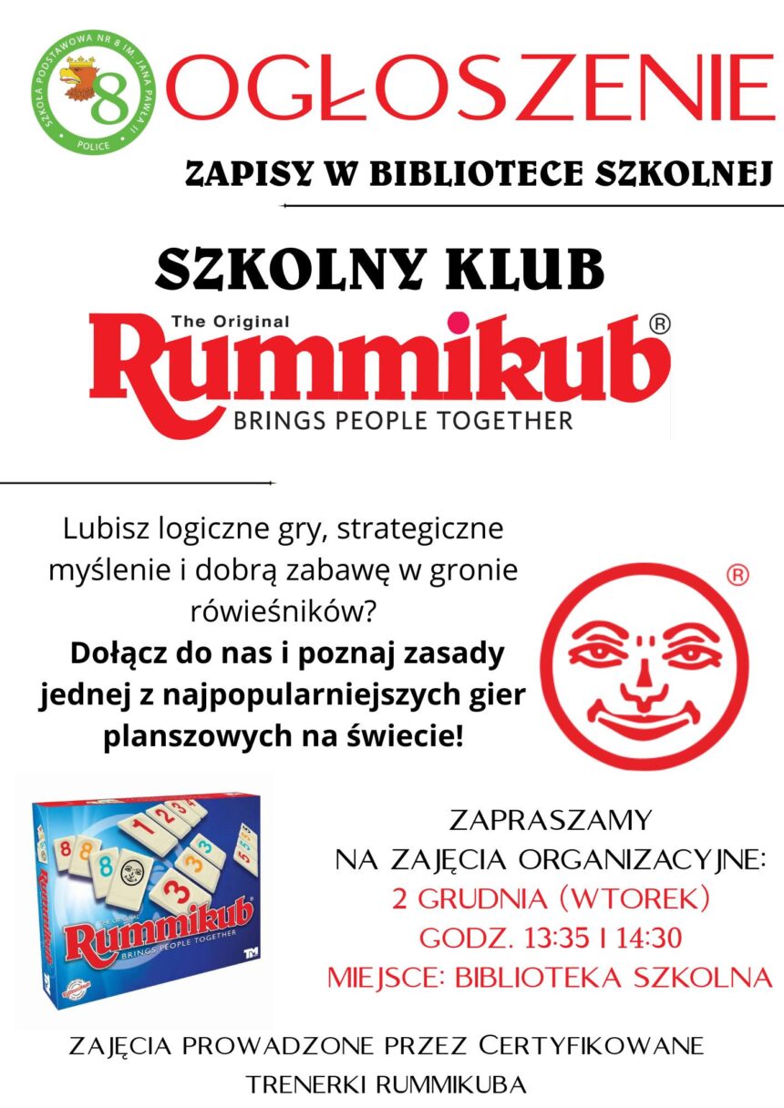 Szkolny Klub Rummikub 25 listopada 2025 Share Tweet Pin it Zapraszamy uczniów klas 4 - 8 do uczestnictwa w Szkolnym Klubie Rummikub. Pierwsze spotkanie organizacyjne: 2 grudnia (wtorek) godz. 13:35 i 14:20. Dla kogo? Dla uczniów:– już potrafiących grać w grę Rummikub;– którzy chcą się dopiero nauczyć;– których interesują jedynie rozgrywki ligowe.Zapisy w bibliotece szkolnej.Zajęcia prowadzone przez certyfikowane trenerki gry. Previous Post Galeria prac z konkursu ,,Zaprojektuj swoją ekotorbę"