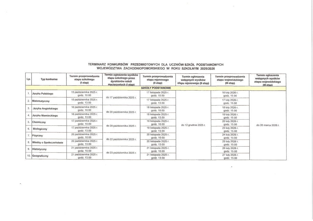 W roku szkolnym 2025/2026 Zachodniopomorski Kurator Oświaty organizuje następujące konkursy przedmiotowe o zasięgu wojewódzkim: